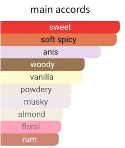 Middle notes: violet, rose water, orange blossom, almond, rum, woody notes, sugar